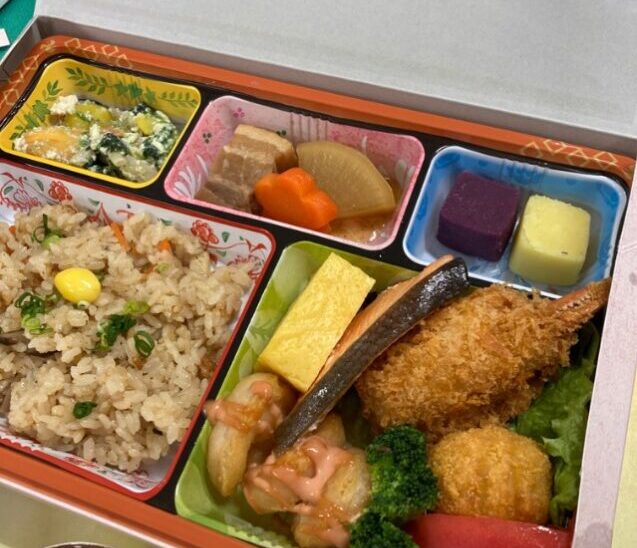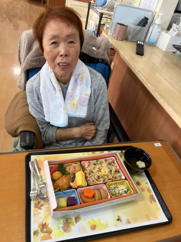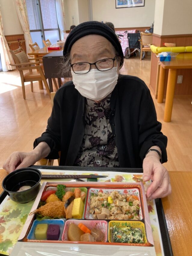 先日、施設で秋の味覚を堪能できる「十月お楽しみメニュー 行楽弁当」をいただきました! 彩り豊かで、ふたを開けた瞬間から歓声が上がるほどの豪華さでした。