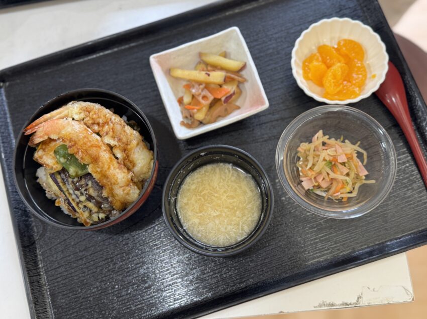 天ぷらの盛り合わせに加え、副菜や温かいお味噌汁、デザートのフルーツも添えて、豪華な献立となりました。