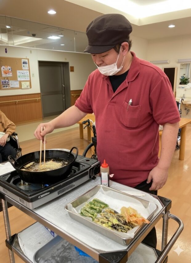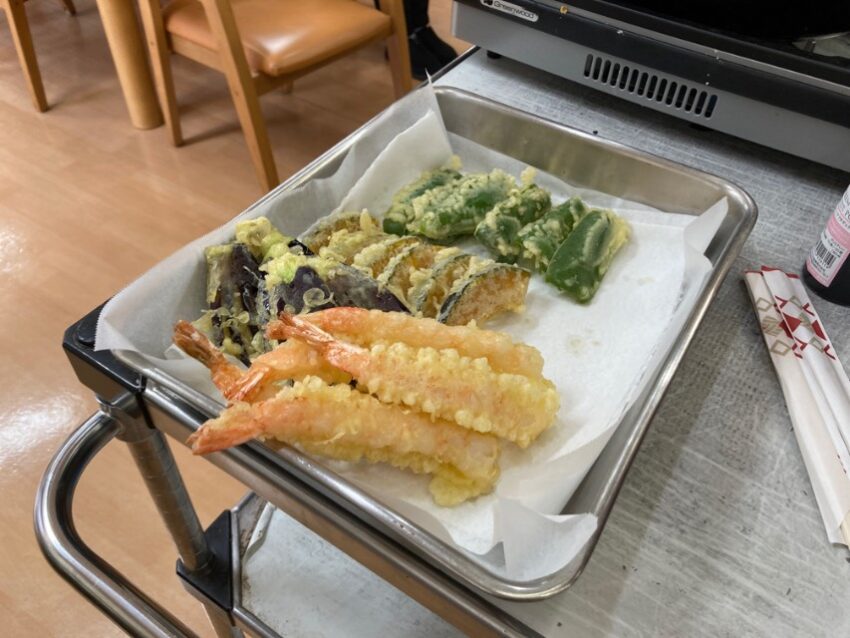 先日、施設で**「天ぷらレクリエーション」**を開催しました!揚げたてアツアツの天ぷらを皆様に召し上がっていただく、食欲の秋にぴったりのイベントとなりました。