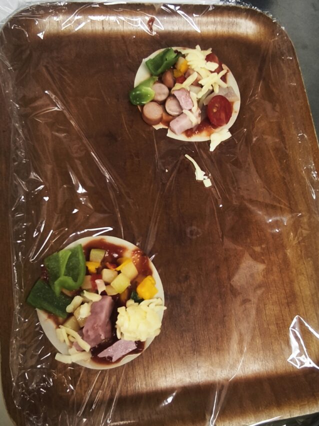 生地は餃子の皮を使用して、トッピング、焼き上げまで、すべて手作業。具材は、トマトやピーマン、玉ねぎ、サラミなど、色とりどりの野菜をご用意しました。 🙂