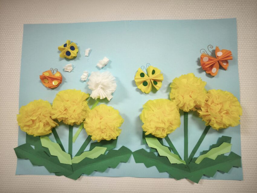 二枚目の作品は、ふんわりとした黄色が印象的なたんぽぽ畑と、優雅に舞う蝶々の貼り絵です。
