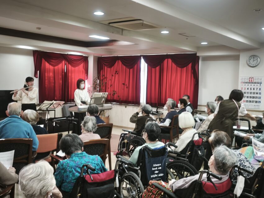 今回は、ユニット名「M&N」によるフルートとキーボードの演奏会。館内のホールは、入居者様で満席となり、開演前から期待の熱気に包まれていました😲