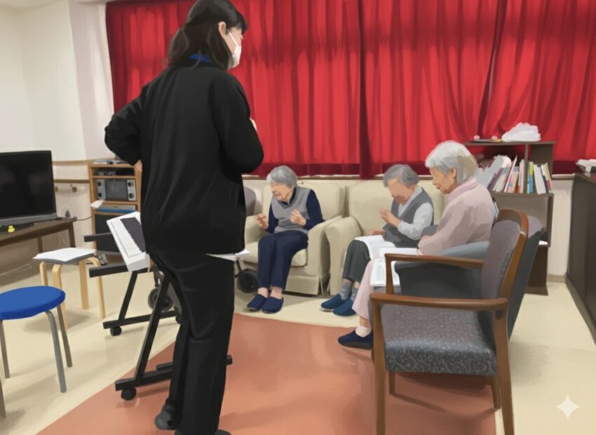 音楽アクティビティーは、ただ歌を聴くだけではありません。 音楽健康福祉士の先生が奏でるキーボードの音色に合わせて、皆さまで声を出し、リズムに合わせて体を動かします。