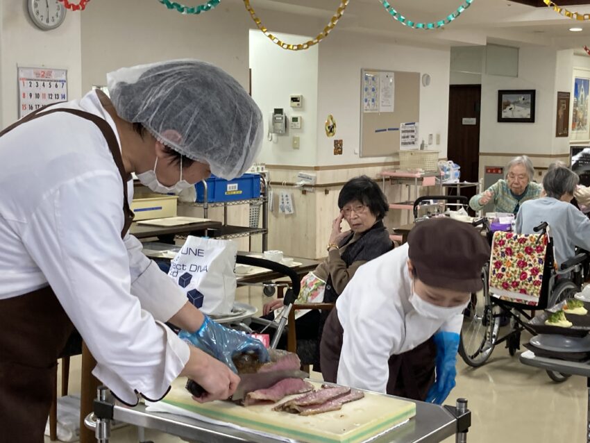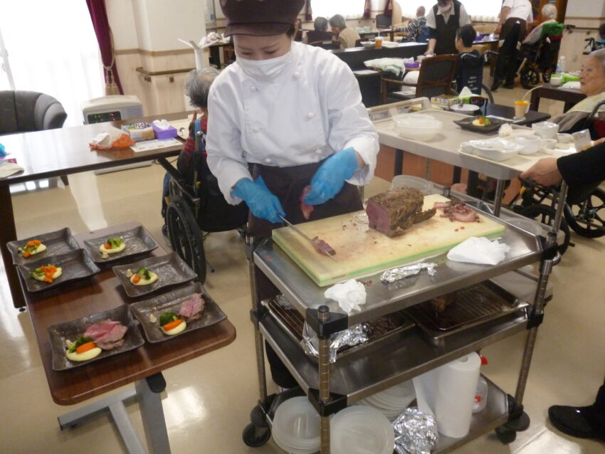 本日2月26日、当ホームでは皆さまお待ちかねの特別献立「ローストビーフ企画」を開催いたしました。今回はただお出しするだけでなく、シェフが皆さまの目の前で仕上げを行う「ライブキッチン」スタイルでお届けしました!