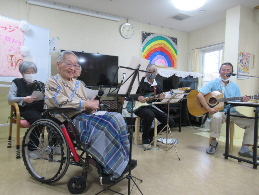 ボランティアの方と職員による本格的な生バンド演奏で、会場は大盛り上がり!ご入居者様と一体となり、懐かしの歌を合唱したり、歌唱を披露し合ったりして、楽しい交流のひとときを過ごしました。