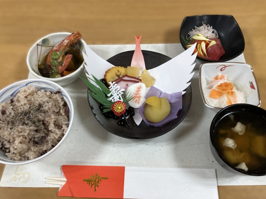 元日には、お赤飯やおせち料理、お雑煮などのお祝い膳をご用意し、「お正月らしいね」と季節を感じながら召し上がっていただきました。