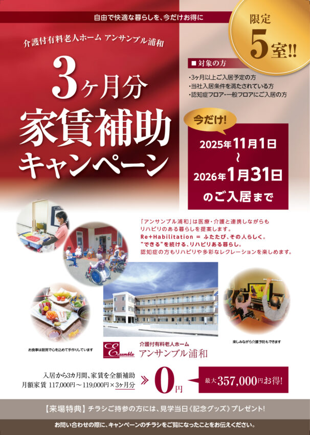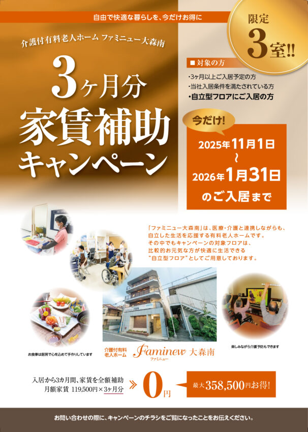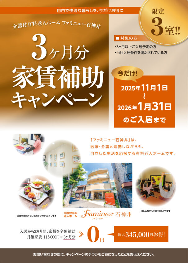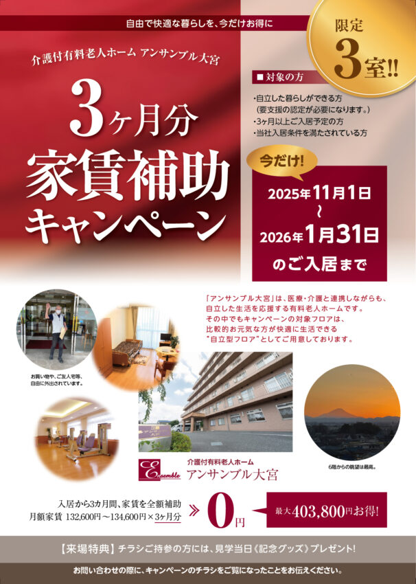 TOP お知らせ アンサンブル浦和・アンサンブル大宮・ファミニュー大森南・ファミニュー石神井で“3カ月家賃補助キャンペーン”実施中!(2026年1月31日ご入居まで) 2025.10.31 お知らせ 費用 ホーム関連情報 アンサンブル浦和・アンサンブル大宮・ファミニュー大森南・ファミニュー石神井で“3カ月家賃補助キャンペーン”実施中!(2026年1月31日ご入居まで) 自由で快適な暮らしを、今だけお得に! ・アンサンブル浦和・アンサンブル大宮・ファミニュー大森南・ファミニュー石神井で“3カ月家賃補助キャンペーン”実施中! 期間 2025年11月1日〜2026年1月31日 対象 アンサンブル浦和・アンサンブル大宮・ファミニュー大森南・ファミニュー石神井に2026年1月末までにご入居いただいたお客様 ※この他対象には条件がございますので、下のチラシをご覧いただくか、各施設までお問い合わせください。 キャンペーンの詳細はこちらから アンサンブル浦和 施設ページ アンサンブル大宮 施設ページ ファミニュー大森南 施設ページ ファミニュー石神井 施設ページ 関連記事はこちら 2025.10.31 埼玉県内のアンサンブル・東京都内のファミニューで“ご入居プレゼントキャンペーン”実施中!(2025年11月〜2026年1月) 2025.07.30 アンサンブル浦和・アンサンブル大宮・ファミニュー大森南・ファミニュー石神井で“3カ月家賃補助キャンペーン”実施中!(2025年9月30日ご入居まで) 2025.07.04 埼玉県内のアンサンブル・東京都内のファミニューで“ご入居プレゼントキャンペーン”実施中!(2025年7月〜9月) 関連記事一覧を見る